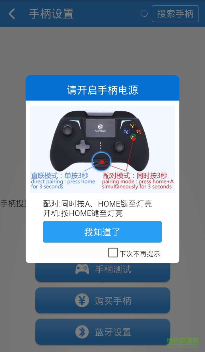 2、界面切換后,會有醒目的提示:“請開啟手柄電源”。此時按住手柄“A”鍵,再按手柄“HOME”鍵啟動手柄,手柄指示燈圖標(biāo)