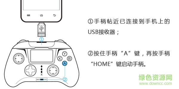 B、手機(jī)和USB無線接收器連接之后,將手柄帖近接收器(盡量減少其他信號干擾)按住手柄的“A”鍵,再按手柄的“HOME”鍵啟動手柄進(jìn)行連接(與藍(lán)牙的連接啟動方式一致)。