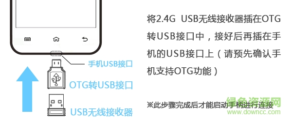 A、將2.4GUSB無線接收器和OTG轉(zhuǎn)USB接口連接上,然后將OTG轉(zhuǎn)換接口的另一端和手機(jī)的USB接口連接(可根據(jù)自己設(shè)備的USB接口大小的情況選擇是否使用OTG轉(zhuǎn)換接口,前提是設(shè)備必須支持OTG功能);