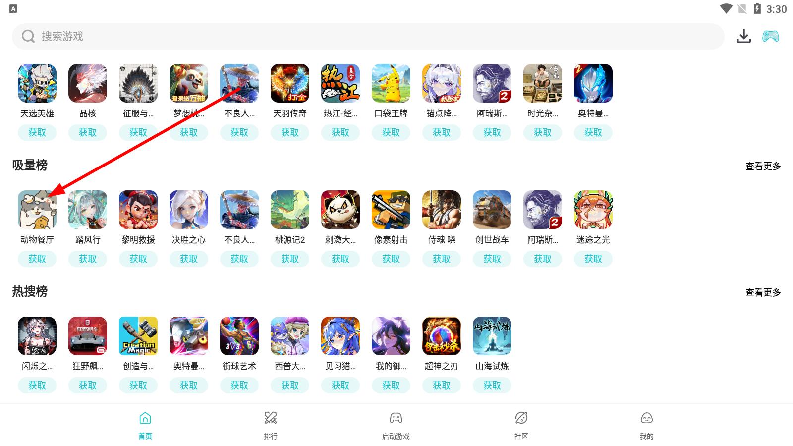 2、在首頁的吸量榜等區(qū)域,找到想要下載的游戲,比如動物餐廳。