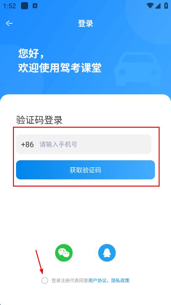 4、選擇驗證碼登錄,輸入手機號,勾選同意相關(guān)協(xié)議選項,點擊獲取驗證碼,輸入驗證碼后完成登錄。