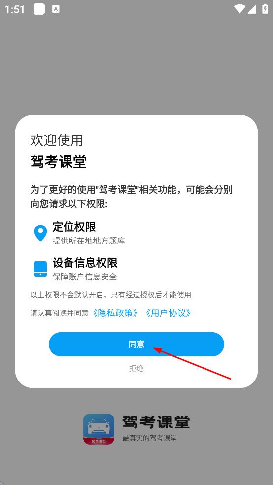 1、打開駕考課堂應用,在權(quán)限請求彈窗中,點擊同意按鈕,進入主界面。