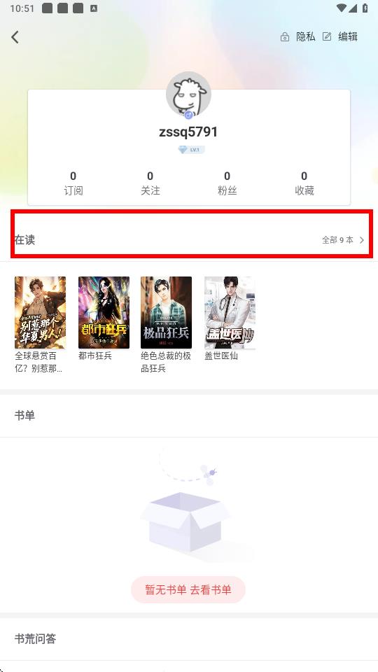 3、在個(gè)人資料界面中找到在讀板塊,點(diǎn)擊全部即可查看