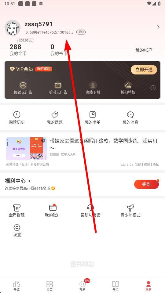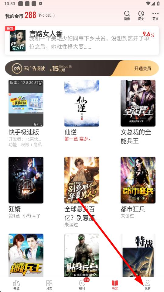 1、打開(kāi)追書(shū)神器app,點(diǎn)擊底部導(dǎo)航欄中的我的選項(xiàng)進(jìn)入個(gè)人頁(yè)面。