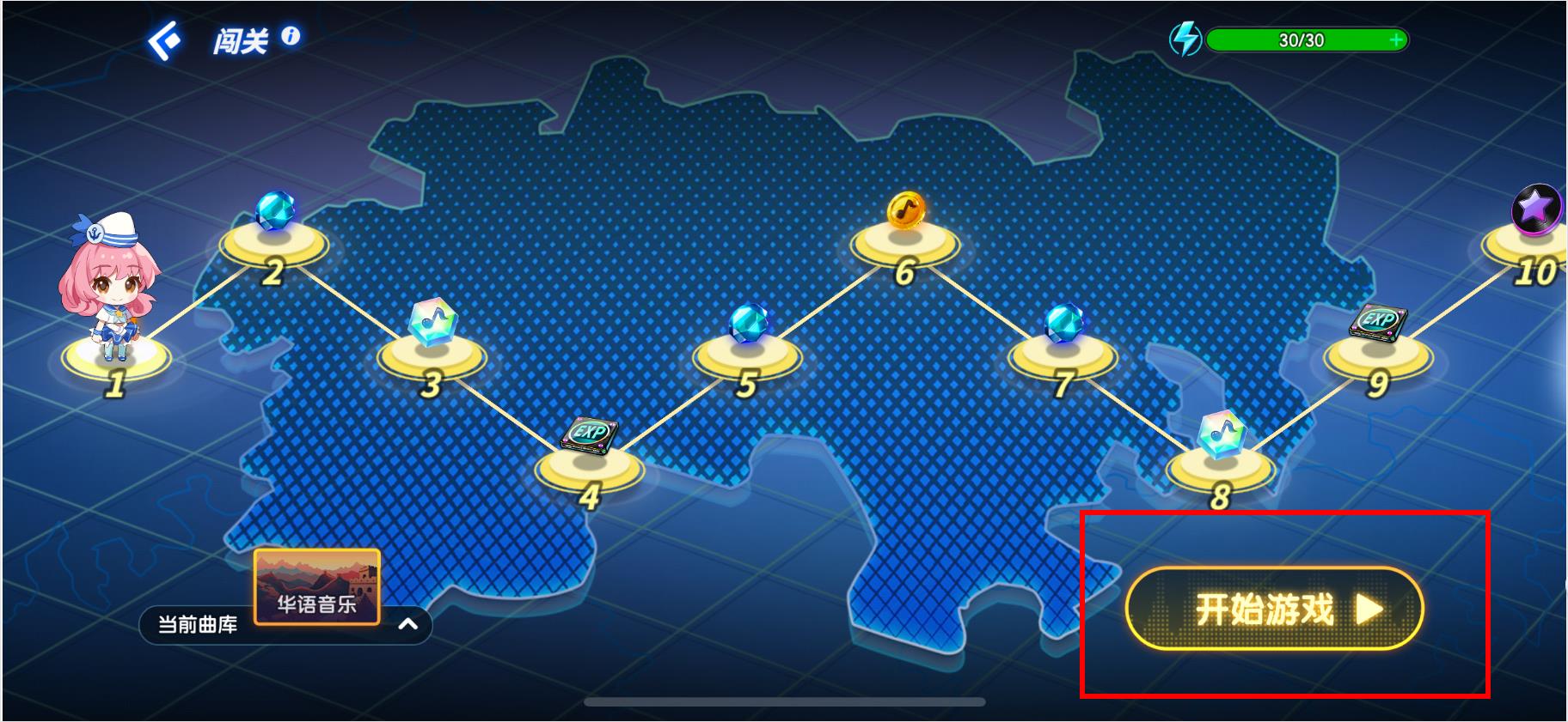 1、點(diǎn)擊闖關(guān)界面的開始游戲按鈕,進(jìn)入關(guān)卡選擇。