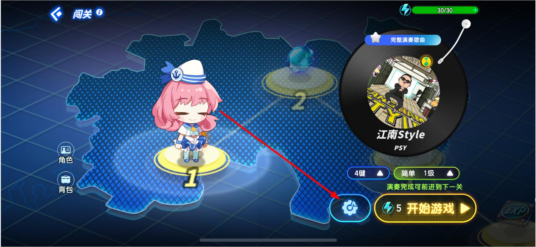 2、在關(guān)卡1界面,點(diǎn)擊設(shè)置圖標(biāo),進(jìn)入設(shè)置頁面。