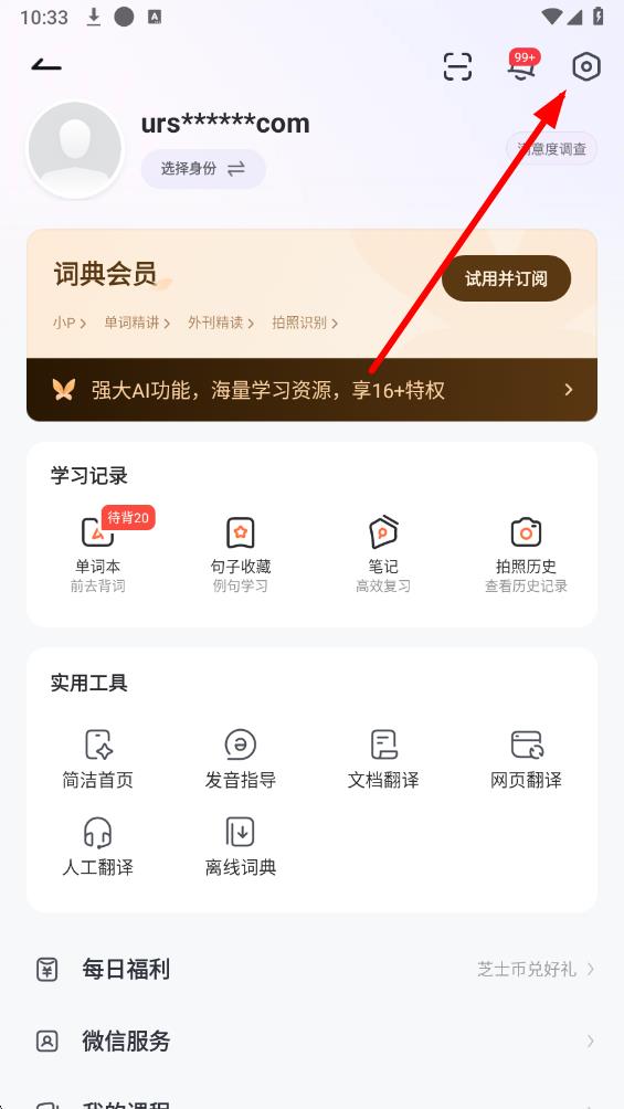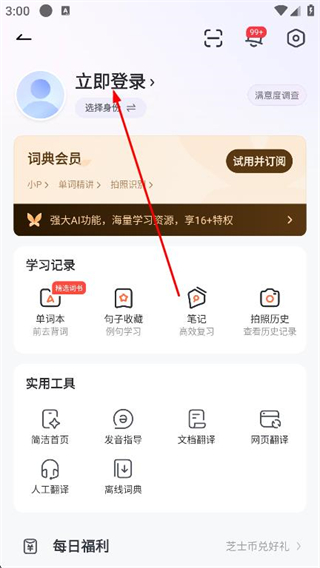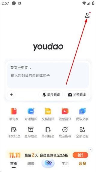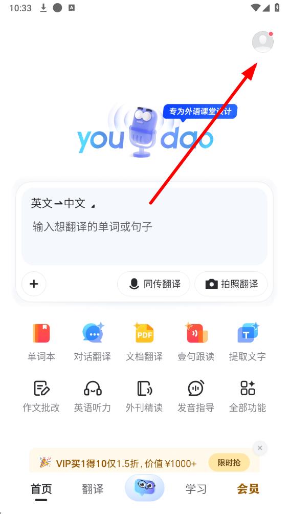 1、打開(kāi)有道詞典app,點(diǎn)擊首頁(yè)右上角的頭像圖標(biāo),進(jìn)入個(gè)人中心頁(yè)面。