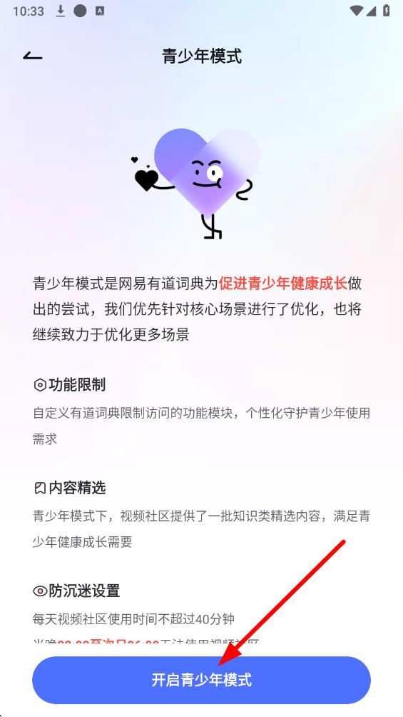 4、在青少年模式頁(yè)面,閱讀相關(guān)介紹后,點(diǎn)擊開(kāi)啟青少年模式按鈕,即可成功開(kāi)啟該功能。