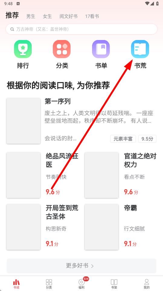 1、打開追書神器,在書城界面點擊右上方書荒圖標(biāo)。