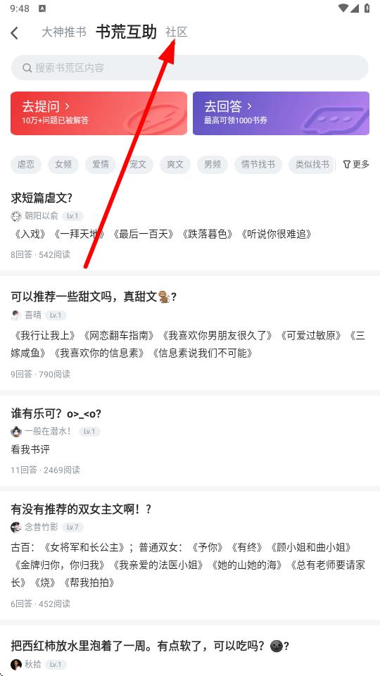 2、進(jìn)入書荒互助頁面后,點擊上方社區(qū)選項。