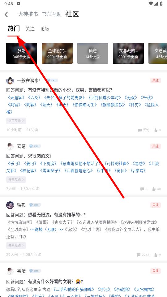 3、在社區(qū)頁面中,點擊熱門標(biāo)簽,即可查看熱門內(nèi)容。