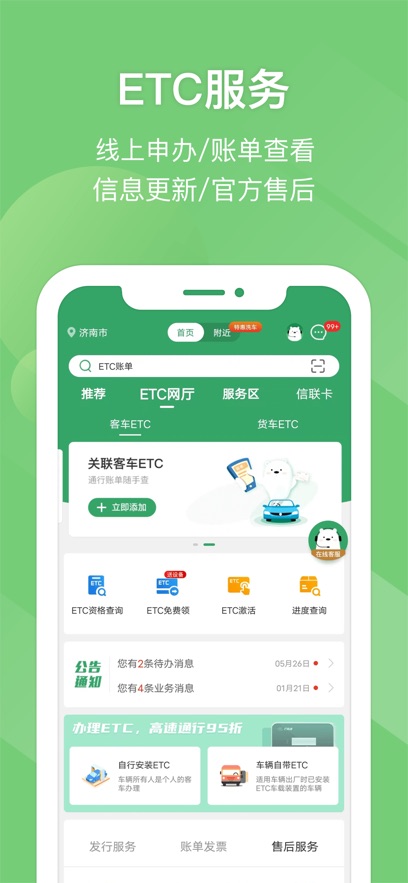 3、用戶在使用ETC過(guò)程中遇到的業(yè)務(wù)問(wèn)題均可在APP上解決,如ETC辦理,安裝引導(dǎo),充值、異常檢測(cè)、賬單查詢、通行費(fèi)發(fā)票開(kāi)具、解綁掛失、更多售后服務(wù)等