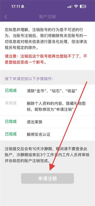 3、在賬戶注銷頁(yè)面,確認(rèn)已完成清除金幣、鉆石、收益,退出家族,解綁實(shí)名認(rèn)證等操作后,點(diǎn)擊申請(qǐng)注銷按鈕。