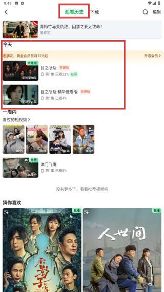 3、進(jìn)入觀看歷史頁面后,即可看到所有看過的視頻記錄,包括今天、一周內(nèi)的觀看內(nèi)容。