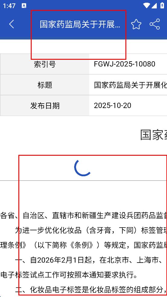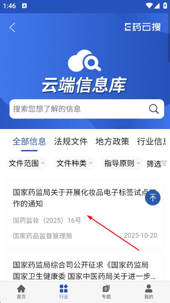 3、在云端信息庫中找到國家藥監(jiān)局關(guān)于開展化妝品電子標簽試點工作的通知,點擊進入詳情頁。