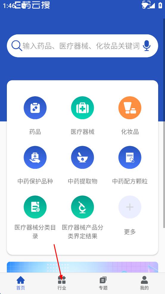 1、打開E藥云搜軟件,點擊底部行業(yè),進入行業(yè)頁面。