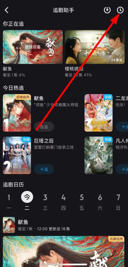 2、進(jìn)入追劇助手頁面后,點(diǎn)擊右上角時(shí)鐘形狀的圖標(biāo)。