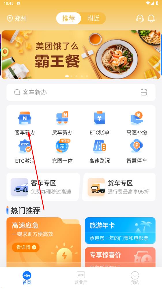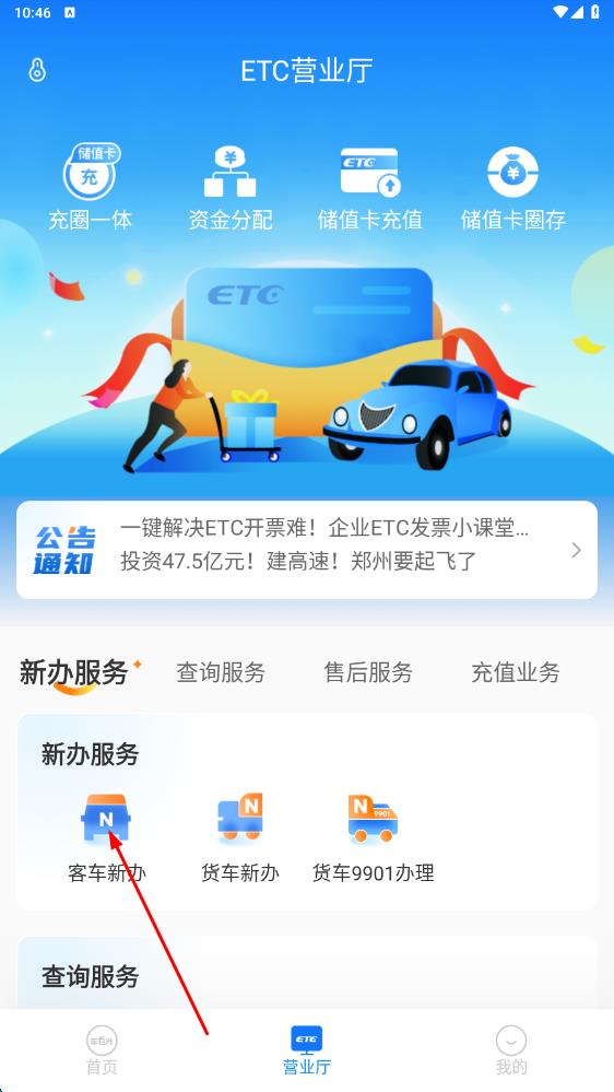 1、進(jìn)入ETC營(yíng)業(yè)廳,在新辦服務(wù)板塊找到“客車新辦”選項(xiàng),點(diǎn)擊進(jìn)入對(duì)應(yīng)業(yè)務(wù)頁面。