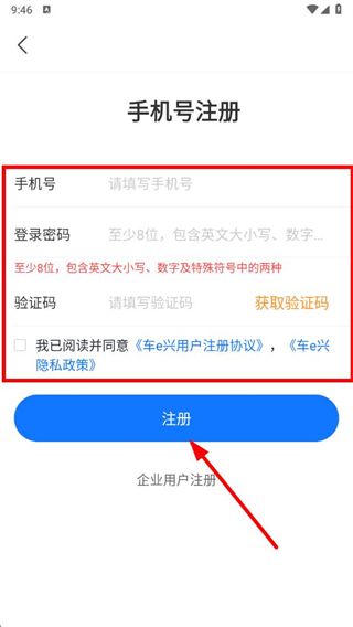 4、在手機(jī)號(hào)注冊(cè)頁面,填寫手機(jī)號(hào)、登錄密碼,獲取并輸入驗(yàn)證碼,勾選同意協(xié)議后點(diǎn)擊注冊(cè)按鈕,完成注冊(cè)操作。
