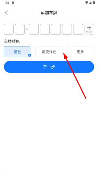 4、在添加車牌頁面,輸入車牌信息并選擇車牌顏色,點(diǎn)擊下一步按鈕,按照提示完成車輛添加操作即可。