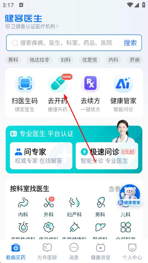 1、打開健客醫(yī)生APP,在首頁點(diǎn)擊去開藥選項(xiàng)。