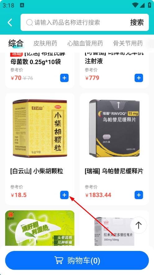 2、進(jìn)入開藥頁面后,找到所需藥品后,點(diǎn)擊+號(hào),將其加入購物車。