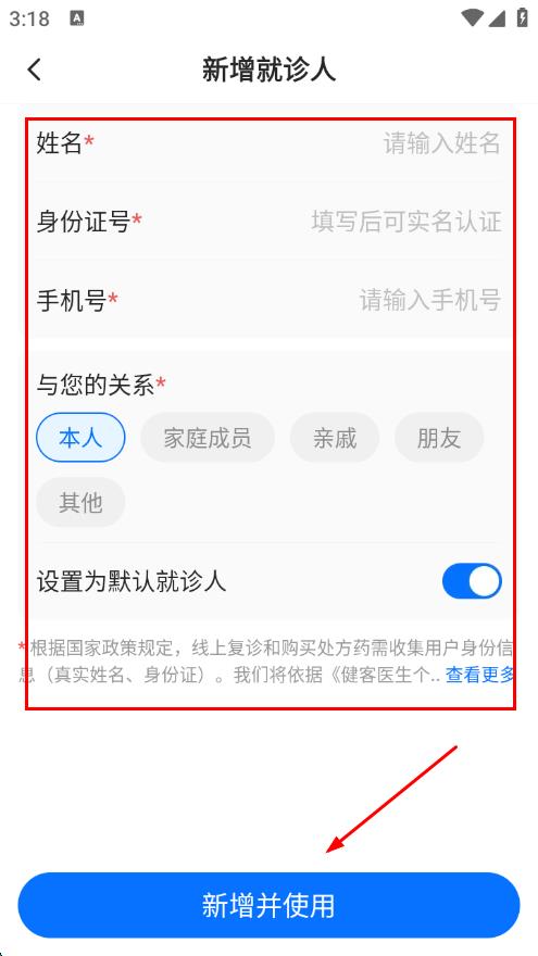 4、在新增就診人頁面,填寫信息,點(diǎn)擊新增并使用,即可完成買藥。