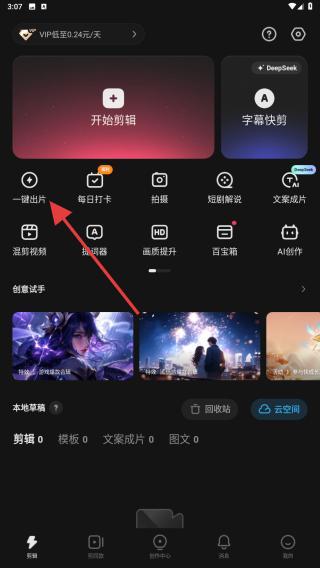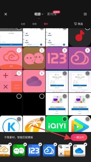 1、打開快影APP,在首頁顯眼位置找到并點擊一鍵出片的按鈕。