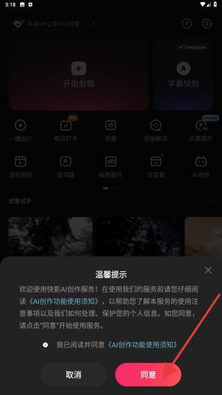 2、點擊后會彈出溫馨提示,需要用戶仔細閱讀,并AI創(chuàng)作功能使用須知,擊同意的按鈕。