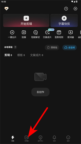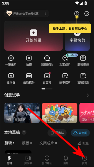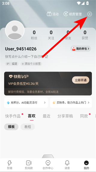 1、打開快影APP,點擊右下角我的,進入個人頁面。