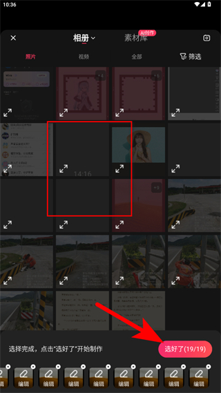 4、在相冊中選擇所需素材,選擇完成后點擊選好了,進入視頻編輯頁面。