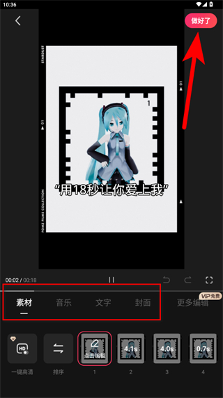 5、在視頻編輯頁面中,可對素材、音樂、文字、封面等進行編輯,完成后點擊右上角做好了,即可完成短視頻制作。