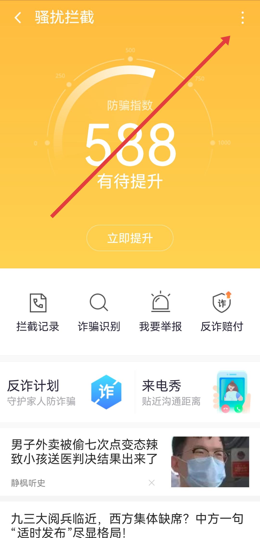 1、進(jìn)入360手機(jī)衛(wèi)士的騷擾攔截頁(yè)面,點(diǎn)擊右上角的三點(diǎn)菜單圖標(biāo),進(jìn)入騷擾攔截設(shè)置界面。