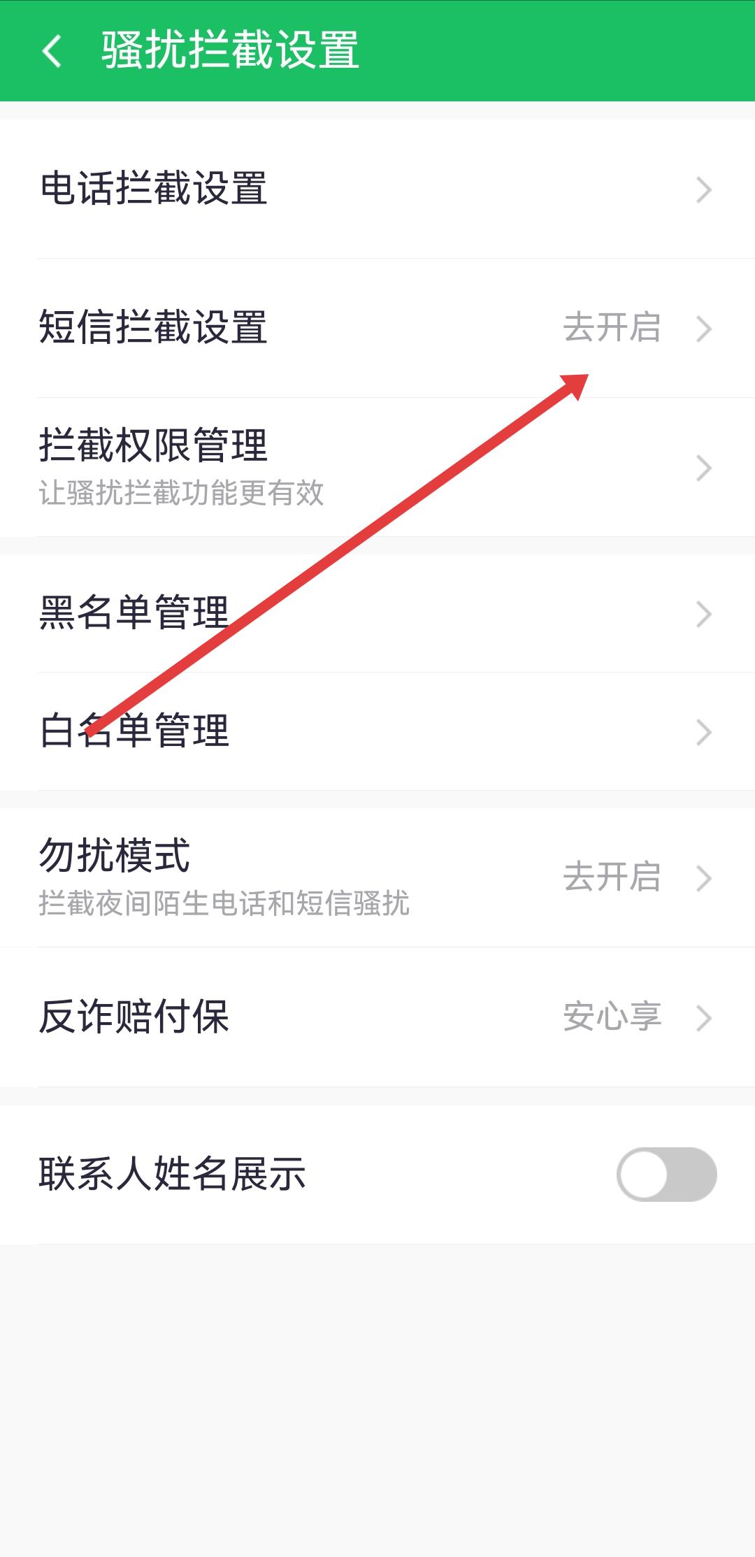 2、在騷擾攔截設(shè)置頁(yè)面中,點(diǎn)擊短信攔截設(shè)置的選項(xiàng),進(jìn)入短信攔截的具體設(shè)置頁(yè)。