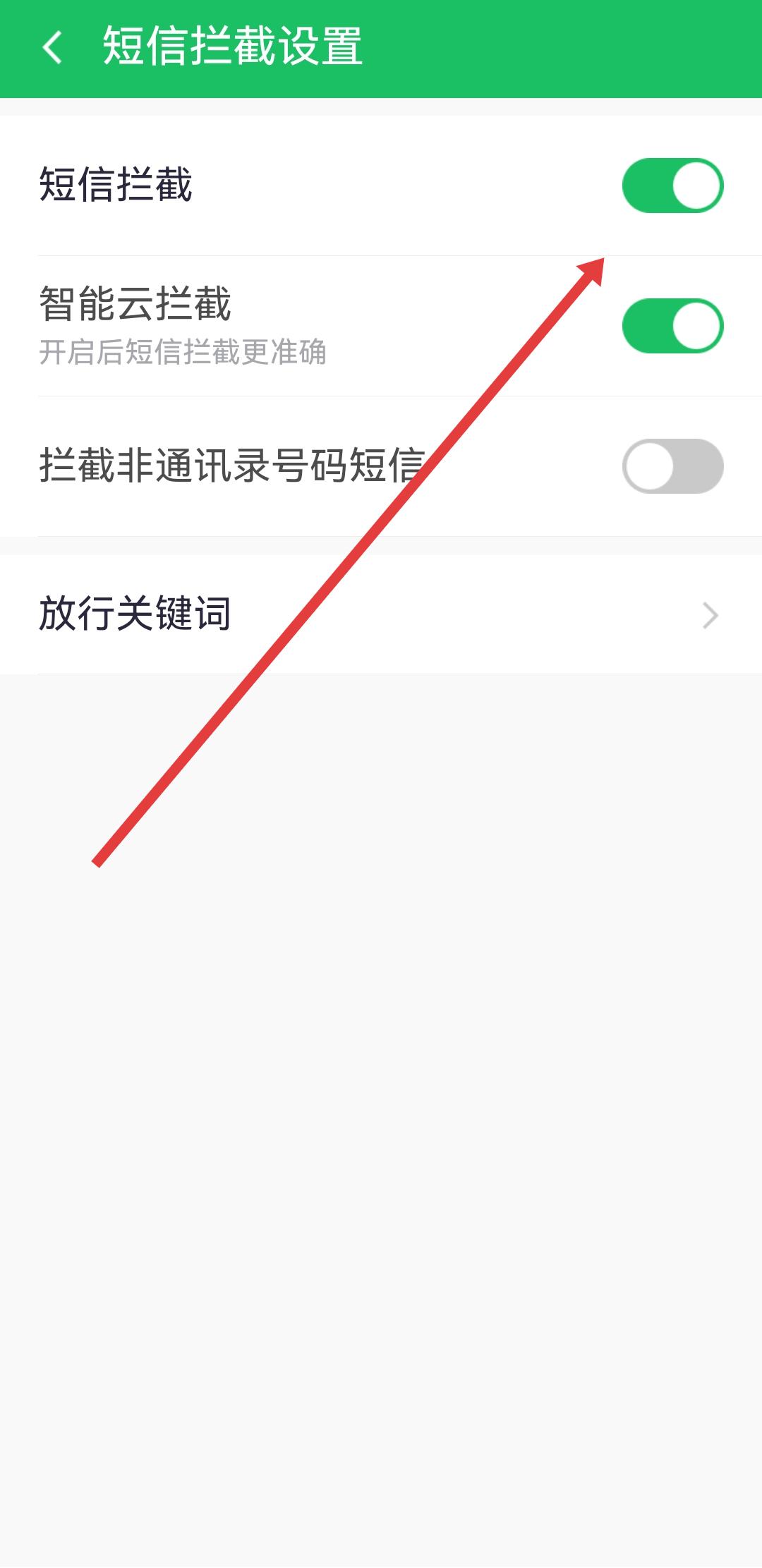 3、在短信攔截設(shè)置的頁(yè)面,開(kāi)啟短信攔截開(kāi)關(guān),即可啟用短信攔截功能,攔截各類騷擾短信。
