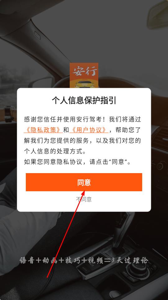 1、打開安行駕考APP,在彈出的個人信息保護指引窗口中,點擊同意按鈕,進入APP主界面。