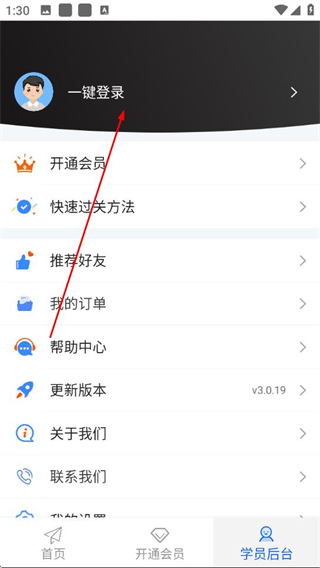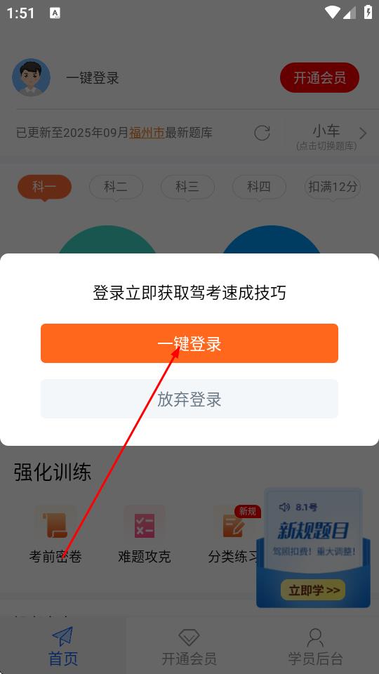 2、在主界面彈出的登錄立即獲取駕考速成技巧提示框中,點擊一鍵登錄選項,進入登錄界面。