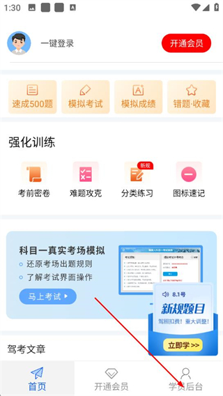 1、打開安行駕考APP,點擊底部學員后臺,進入個人中心頁面。