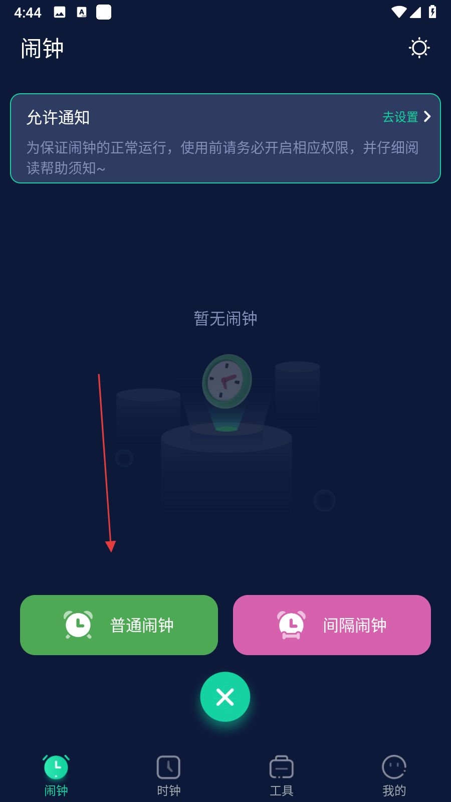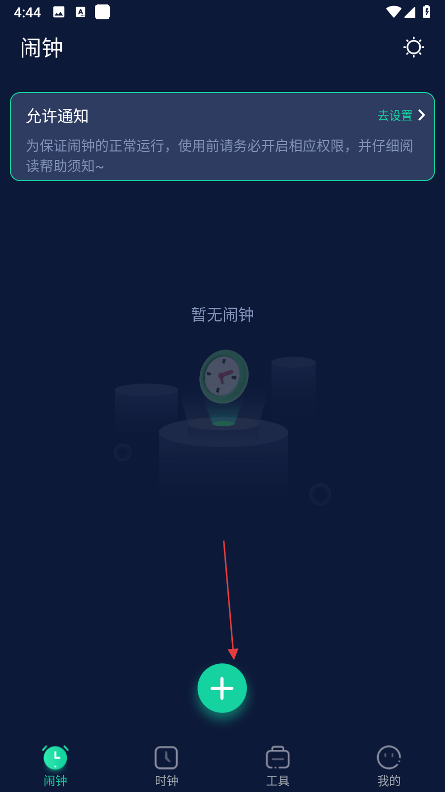 1、打開手機(jī)鬧鐘應(yīng)用,在鬧鐘主界面點(diǎn)擊底部綠色+按鈕。