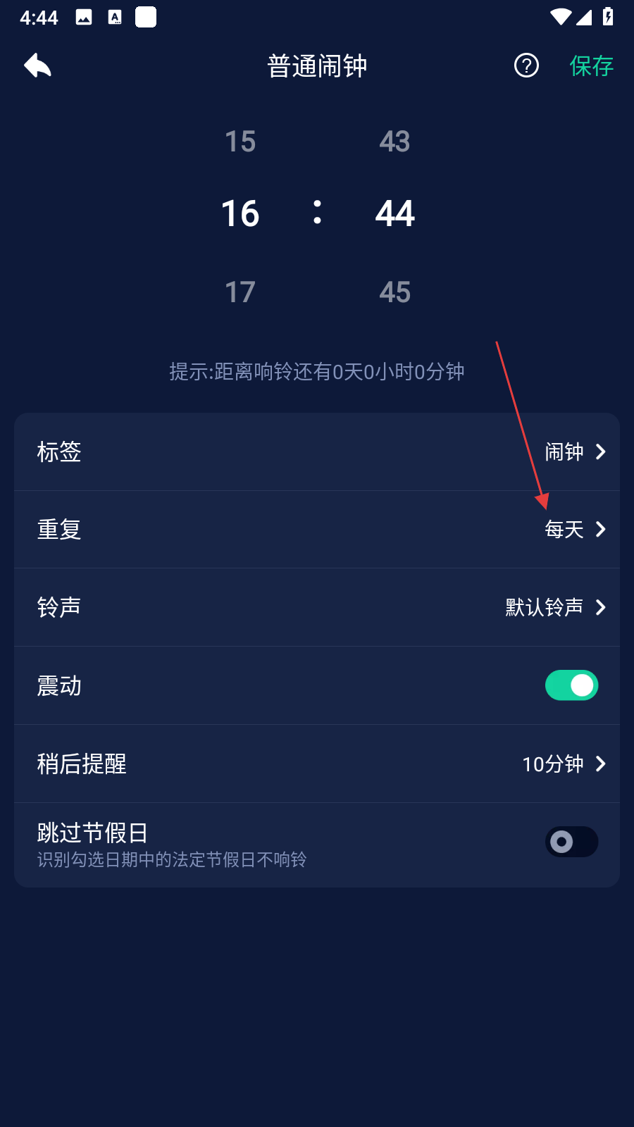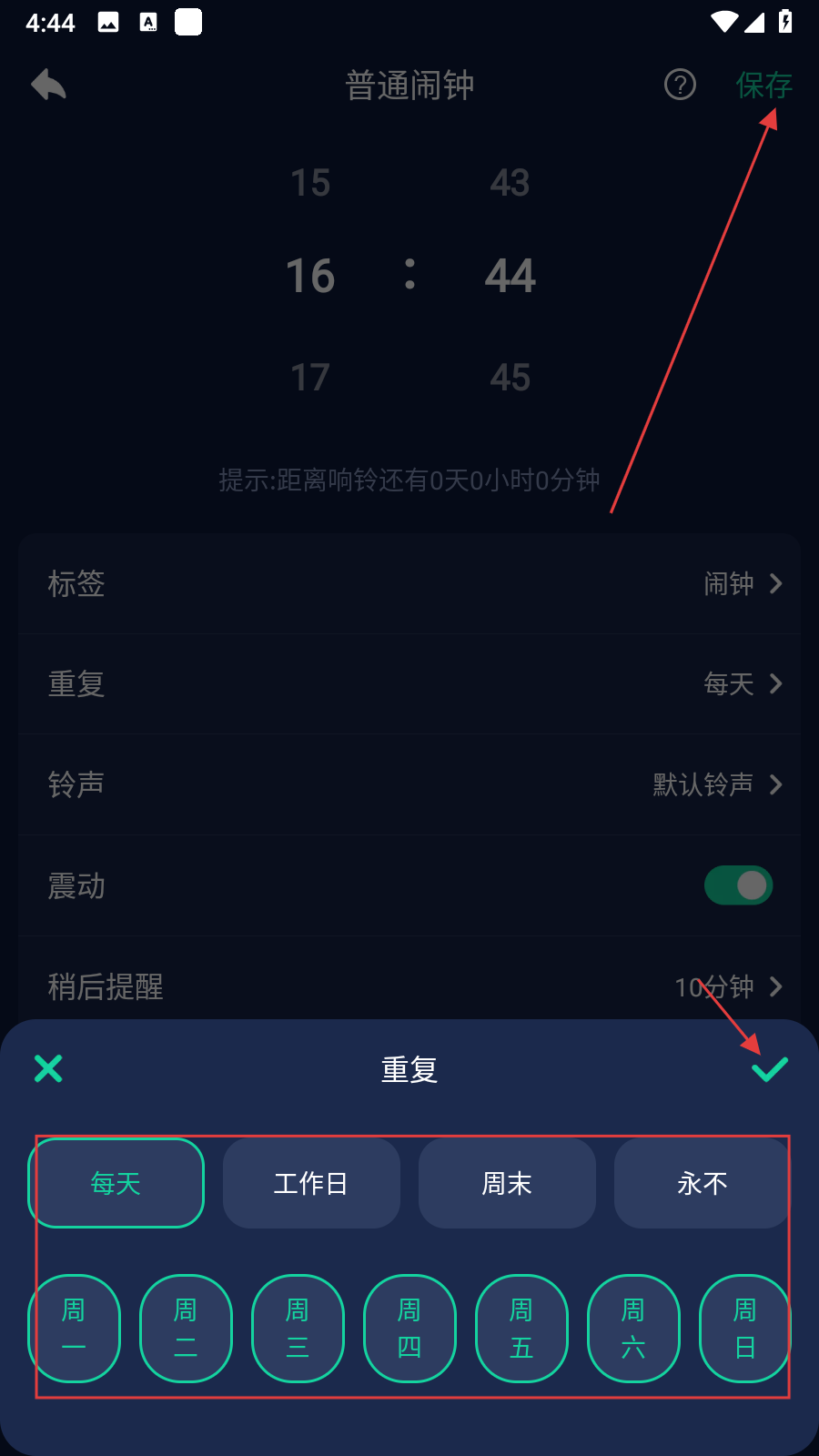 4、根據(jù)需求調(diào)整重復(fù)等選項(xiàng),點(diǎn)擊打鉤即可設(shè)置完成,點(diǎn)擊右上角保存。