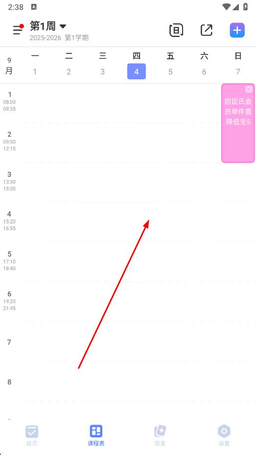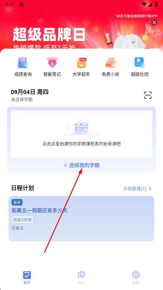 1、打開超級(jí)課程表APP,進(jìn)入首頁,點(diǎn)擊+選擇我的學(xué)期。