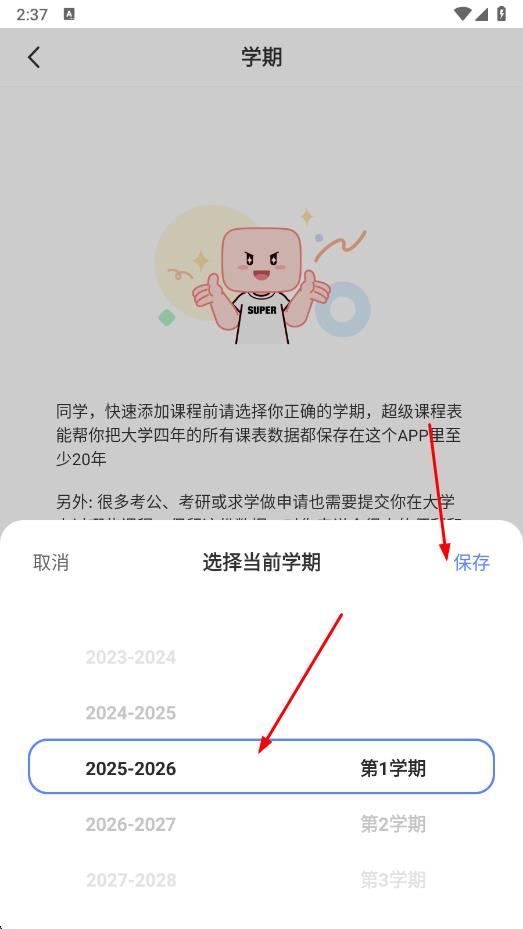 2、在彈出的選擇當(dāng)前學(xué)期界面,選擇對(duì)應(yīng)的學(xué)年學(xué)期,點(diǎn)擊保存。