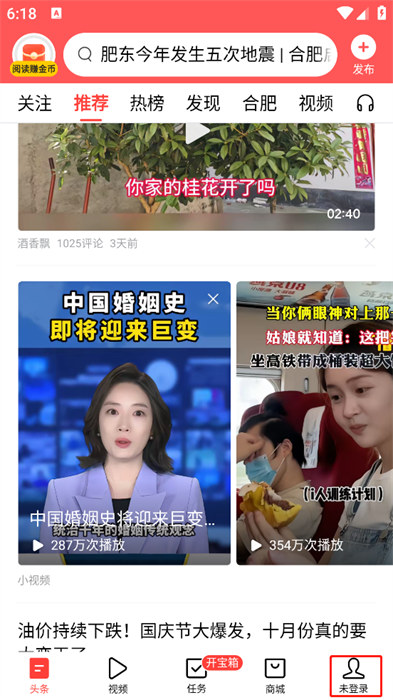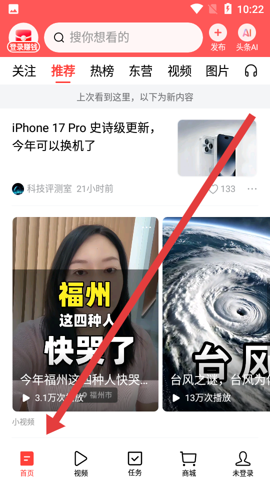 1、點擊今日頭條安卓版app怎么使用教程底部首頁,進入推薦內(nèi)容頁面,瀏覽資訊、小視頻等各類信息。