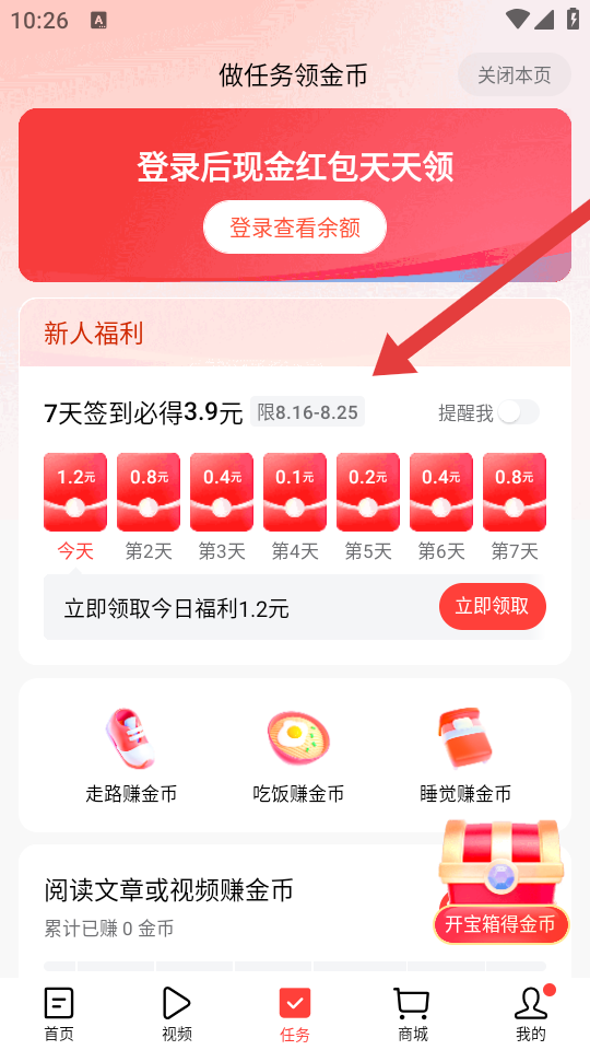 3、進入今日頭條安卓版app任務(wù)頁面,參與7天簽到必得3.9元等新人福利活動,完成任務(wù)領(lǐng)取金幣或現(xiàn)金獎勵。