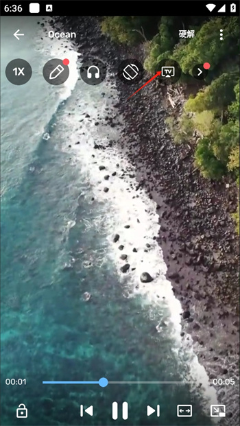 3、在進(jìn)入到視頻之后點(diǎn)擊一下屏幕,上方就會(huì)出現(xiàn)一系列的功能,這里有一整個(gè)投屏的選項(xiàng),點(diǎn)擊這個(gè)選項(xiàng)開始投屏;