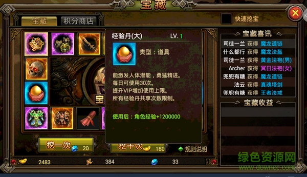 寶藏系統(tǒng)44級(jí)解鎖,挖寶藏最多的是什么?沒錯(cuò)就是大經(jīng)驗(yàn)丹,一顆經(jīng)驗(yàn)丹120萬經(jīng)驗(yàn),有木有心動(dòng),心動(dòng)就快去挖寶藏吧,一大波經(jīng)驗(yàn)正向你襲來啊,小R非R也不用擔(dān)心,活動(dòng)里面首周目標(biāo)水晶送、送、送啊,沒有元寶一樣挖寶藏。當(dāng)然大家使用經(jīng)驗(yàn)丹的時(shí)候需要注意一下,這個(gè)每天是有次數(shù)限制的,所以想要等級(jí)升得比別人快,要注意優(yōu)先使用經(jīng)驗(yàn)丹(大)哦,不然一包包的大經(jīng)驗(yàn)丹放包包里也是沒什么用的。