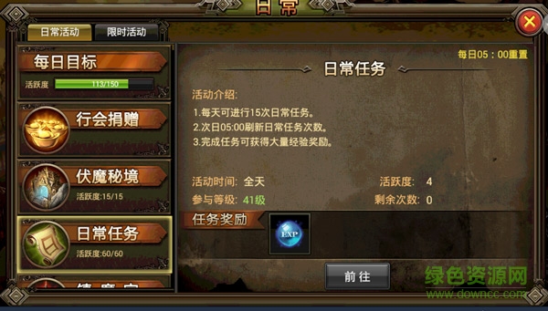 日常任務(wù)53級(jí)解鎖,每天可以領(lǐng)取15次,一次經(jīng)驗(yàn)比一次的高,所以大家每天的日常任務(wù)要做完哦,不要偷懶,剩幾次,你剩幾次沒做的切是經(jīng)驗(yàn)最高的,那就虧大了,日常任務(wù)基本打怪為主,要想做得快,拉上隊(duì)友一起吧,人多力量大,15次也是很快就能搞定的