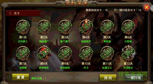 混亂深淵52級(jí)解鎖,共計(jì)32個(gè)關(guān)卡,沒通過一個(gè)關(guān)卡都有豐富的經(jīng)驗(yàn)、以及行會(huì)貢獻(xiàn)和行會(huì)經(jīng)驗(yàn),重要的是通關(guān)之后不用每次都去打,支持一鍵掃蕩已經(jīng)通關(guān)的關(guān)卡哦!首通后每天小手一點(diǎn),經(jīng)驗(yàn)就到手了,千萬別忘記,其次VIP有重置次數(shù),花90元寶就可以重置了,很是劃算的。