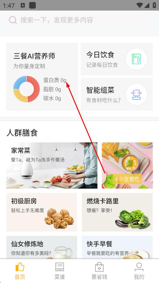 1、打開嘉肴健康美食菜譜App,在首頁點擊三餐AI營養(yǎng)師選項。