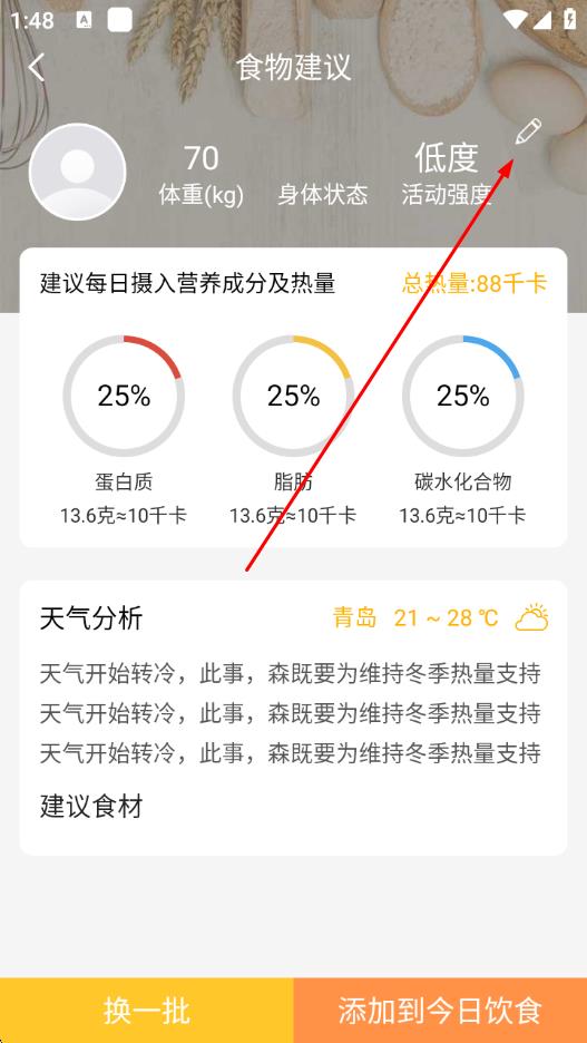 2、進入食物建議頁面后,點擊右上角的編輯圖標,編輯個人信息。